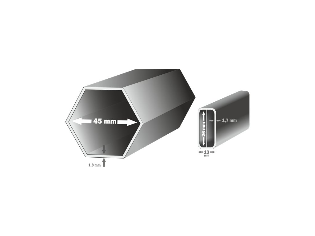 ? A felső lábszár alumínium profilja: | šestihran, průměr 4,5 cm, norma AW 6060 T66 |