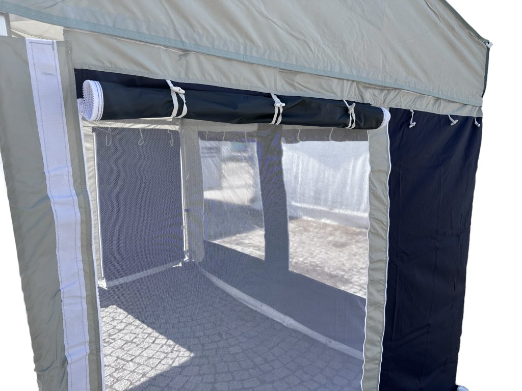 Bemutatjuk a SMALL HEXAGON CARAVAN TOURER ollós napellenzőt, amely nagyszerű választás mindazok számára, akik minőségi és praktikus napellenzőt keresnek lakókocsijukhoz. Ez az elegáns és praktikus árnyékoló kifejezetten lakókocsik számára készült, és rengeteg helyet kínál a kikapcsolódáshoz és a természetben töltött kellemes pillanatokhoz. Az ollós rendszer lehetővé teszi a lakókocsira való gyors és egyszerű felszerelést. A tartós, mégis könnyű szerkezet és a kiváló minőségű burkolat megvédi az esőtől, a széltől és a napfénytől. A rolóval ellátott hálós ablakok rengeteg privátszférát biztosítanak, ugyanakkor kellemes szellőzést biztosítanak.