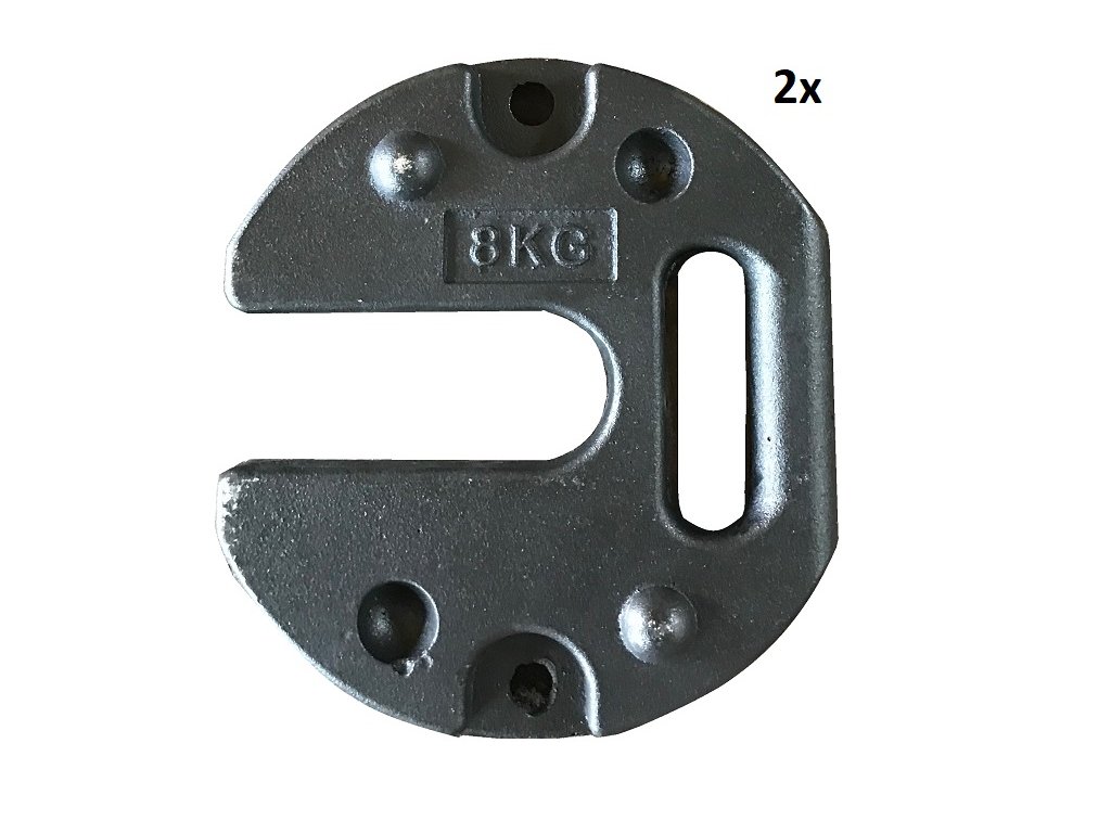 A készlet 2 db, egyenként 8 kg-os súlyt tartalmaz (= összesen 16 kg), amelyeket egymással szemben lévő lábra kell rögzíteni.