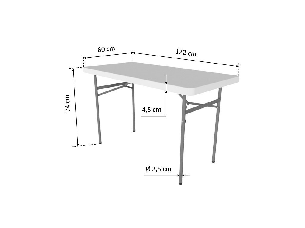 Professzionális összecsukható kempingasztal, 4 fő részére alkalmas. Különböző divatos rendezvényekre alkalmas - esküvőkre, ünnepségekre, céges rendezvényekre - bárhol, ahol lenyűgözni szeretné vendégeit. A felső polietilén lap nagy tartósságú, könnyen mosható. A hagyományos bútorokhoz képest sokkal könnyebb kezelni, előnye a tökéletes kompaktság és mobilitás. Természetesen lehetőség van ismételt telepítésre és leszerelésre. Még a legigényesebb üzemeltetési követelményeket is kielégíti mind a bérbeadás, mind a vendéglátóipar területén. Számos hasonló méretű asztallal kompatibilis.