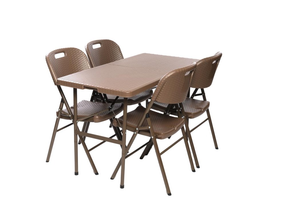 Élvezze a klasszikus rattan bútorok ihlette kerti szett kényelmét és stílusát. A rattan szett egy 122x60 cm-es félbevágott asztalt és négy összecsukható széket tartalmaz, amelyek könnyen összeszerelhetők és szétszerelhetők. Ez a rattan kerti bútor nemcsak stílusos, hanem praktikus és tartós is. Az időtlen dizájn biztosítja, hogy ez a szett nélkülözhetetlen részévé váljon kertjének vagy teraszának.