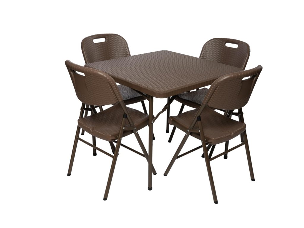 Ez a kerti szett ideális 4 fő kényelmes étkezéséhez bárhol, ahol csak szeretné. Az ajánlat egy rattan asztalt és rattan székeket tartalmaz, amelyek könnyen moshatók, nem igényelnek karbantartást, és egyszerűen kezelhetők, szállíthatók és tárolhatók. Összecsukva a székek egymásra rakhatók. A szett alkalmas családi összejövetelekre, ünnepségekre, nyaralóknak, kempingezőknek, horgászoknak, versenyzőknek, iskoláknak, óvodáknak, önkormányzati és városi kulturális központoknak, valamint cégek rendezvényeire.