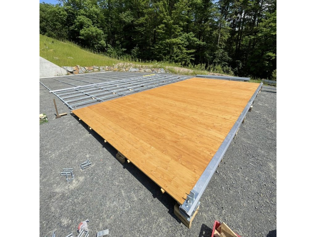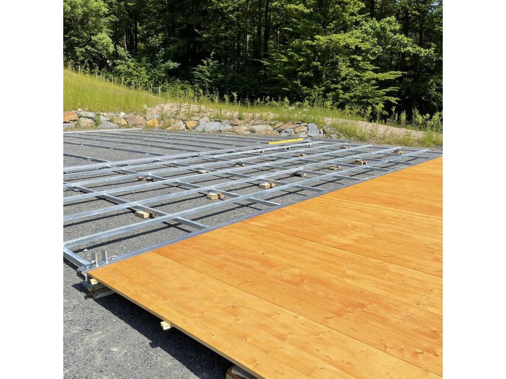 24x146 mm-es ''O'' AB profilú lucfenyő deszkákból készült fa deszkák, a deszka szélessége 55 cm, hossza 491 cm, az alsó gerendák alulról fúrva horganyzott rapitec csavarokkal