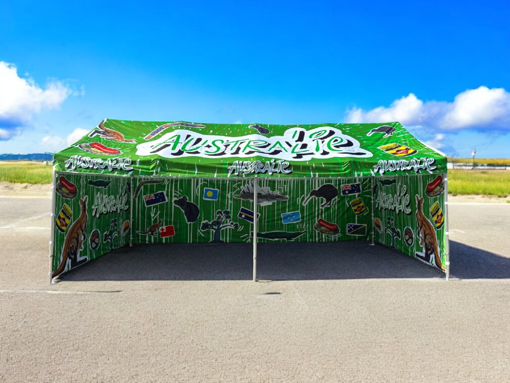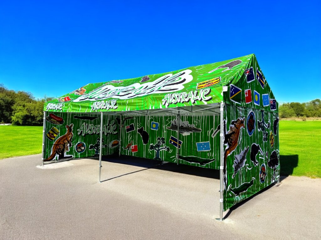1. LEHETŐSÉG - tető teljes hosszúságú nyomtatással a tetején és fodrok + 2x 3 m-es oldalpanel + 1x 6 m-es oldalpanel teljes egyoldalas, teljes hosszúságú nyomtatással