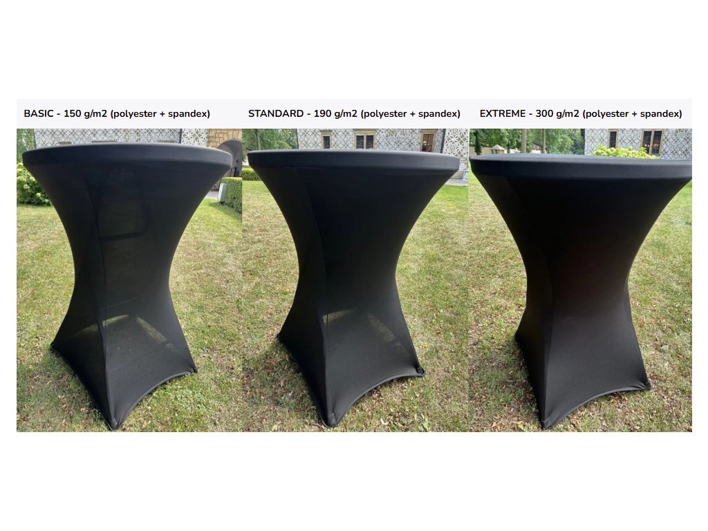 MostEXTREME változatban is kínálunk rugalmas terítőket bisztróasztalokhoz, 300 g/m 2 anyagvastagsággal . A 80 cm átmérőjű terítők 70 cm tetejű koktélasztalokhoz is használhatók. Ha páratlan, sőt hosszabb élettartamot keres, akkor ez a termék pontosan Önnek való. Az extrém anyagvastagság nem alkalmas olyan helyzetekre, amikor egy koktélasztalt rugalmas huzattal és LED lámpával kell megvilágítani. Az anyag nagy súlya tompítja a fényt. Ha rugalmas huzatokkal szeretné megvilágítani a bisztróasztalokat, és ezáltal még jobban kiemelné rendezvénye összképét, válasszon egy könnyebb súlyú klasszikust.