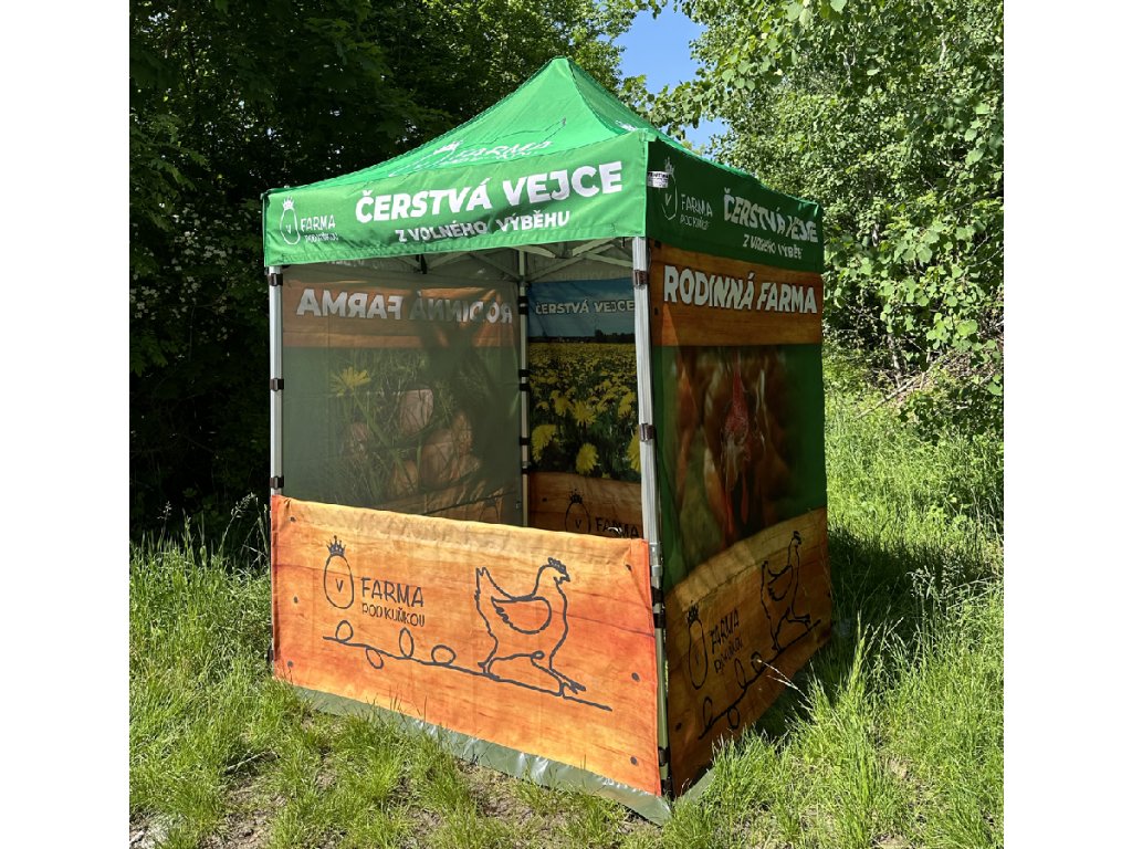 3. LEHETŐSÉG - tető teljes hosszúságú nyomtatással a tetején és fodros díszítéssel + 3 db 2 m-es oldalsó panel + 1 db 2 m-es féloldalas panel teljes egyoldalas, teljes hosszúságú nyomtatással