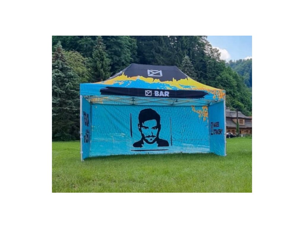 1. LEHETŐSÉG - tető teljes hosszúságú nyomtatással a tetején és fodrok + 2x 3 m-es oldalpanel + 1x 4,5 m-es oldalpanel teljes egyoldalas, teljes hosszúságú nyomtatással